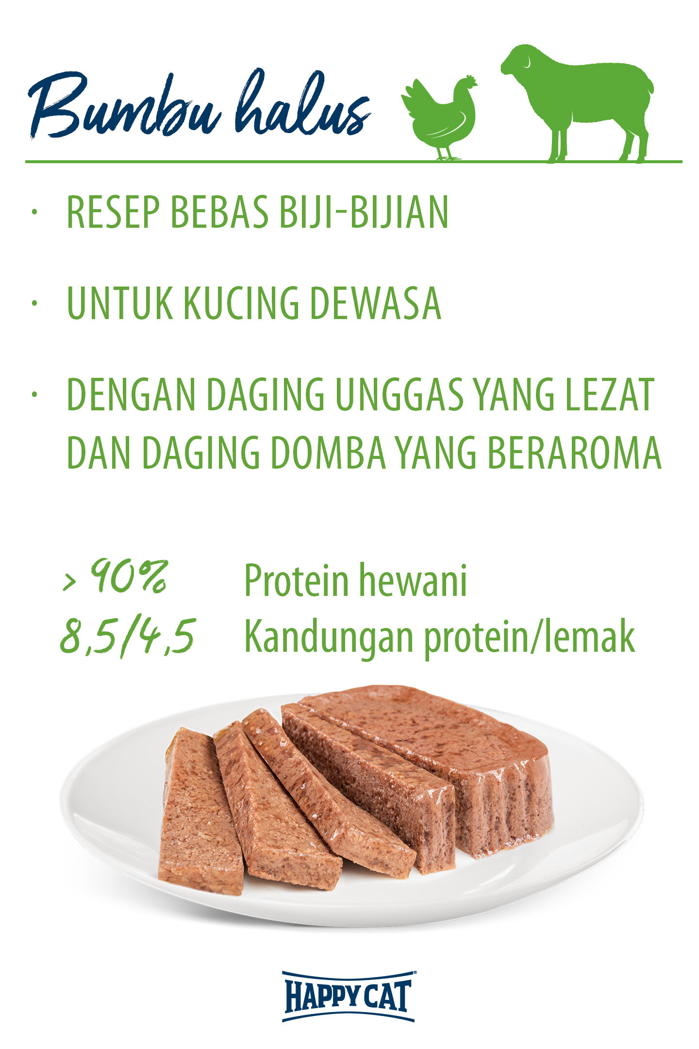 Makanan Basah Happy Cat - untuk si kucing mungil pencinta makanan lezat. Agar Anda bisa memanjakan kucing Anda dan tetap memberi mereka makanan yang sehat. Dengan makanan basah Happy Cat, Anda selalu dapat memastikan variasi lezat untuk kucing Anda. Resep Minkas Duo menawarkan dua rasa yang lezat – pâté atau daging cincang dan potongan daging dalam saus. Happy Cat Minkas Duo selalu menawarkan dua jenis makanan daging atau ikan – untuk kenikmatan lebih.
