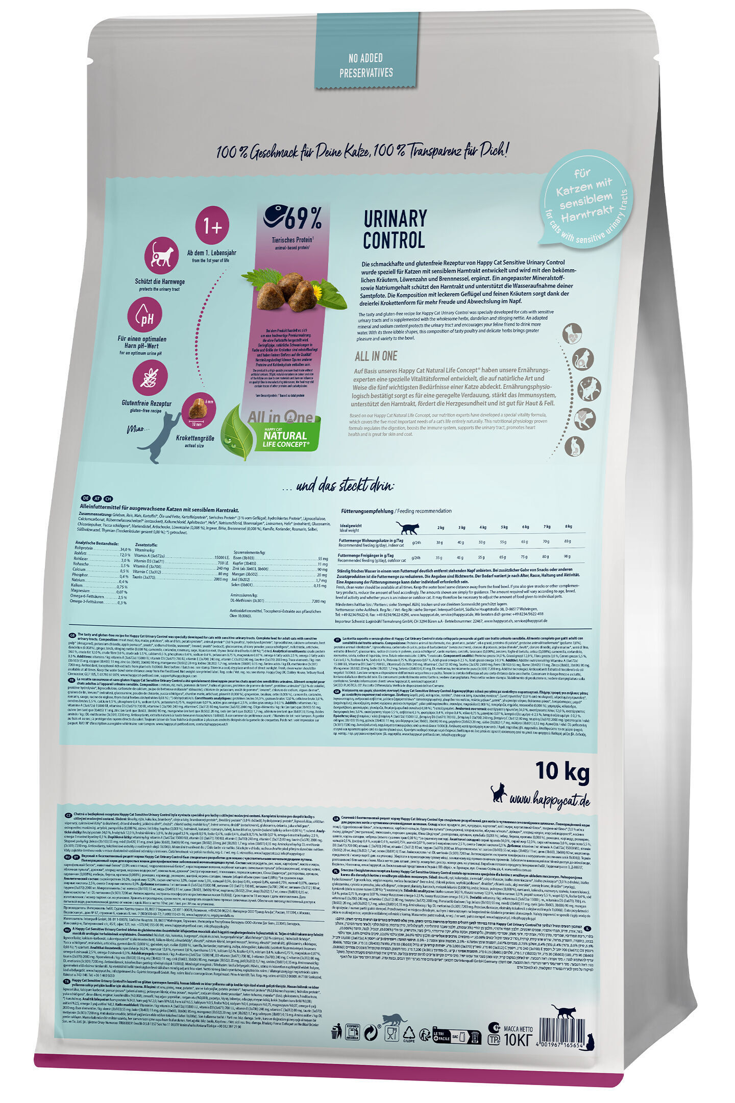 Resep makanan kucing Happy Cat Sensitive Urinary Control dirancang khusus oleh pakar nutrisi kami bagi kucing dengan saluran kemih sensitif yang cenderung berkembang menjadi masalah saluran kemih. Kandungan metionin yang meningkat (yang membuat pH urin lebih asam) melindungi saluran kandung kemih kucing Anda. Kadar mineral seperti kalsium, fosfor dan magnesium dalam makanan juga dikurangi. Ini memberikan perlindungan tambahan untuk saluran kemih kucing yang sensitif.