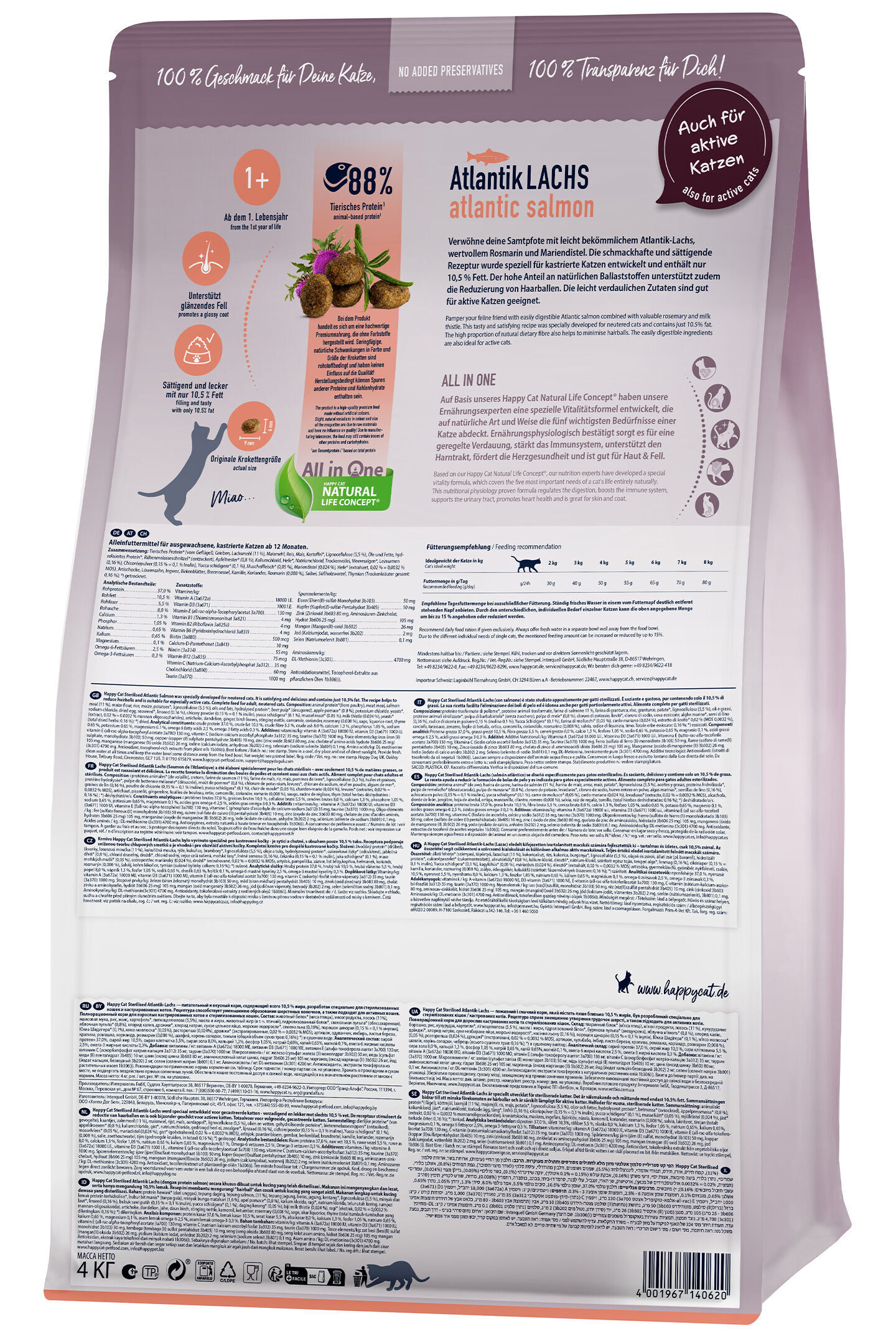 Protein hewani* (dari unggas), tepung daging, tepung salmon, (11 %), tepung jagung, beras, jagung, kentang*, lignoselulosa (5,5 %), minyak dan lemak protein terhidrolisis*, bubur bit manis* (tanpa gula), apel pomace* (0,8 %), kalium klorida, ragi*, natrium klorida, telur utuh kering, rumput laut*, linseed (0,16 %), bubuk sawi putih (0,15 % = 0,1 % inulin), yucca schidigera* (0,1 %), daging kerang* (0,05 %), biji milk thistle (0,024 %), ragi* (ekstrak, 0,02 % = 0,0032 % mannan-oligosakarida), artichoke, dandelion, jahe, daun birch, stinging nettle, kamomil, ketumbar, rosemary (0,008 %), sage, akar liquorice, thyme (total tumbuh-tumbuhan yang dikeringkan: 0,16 %)