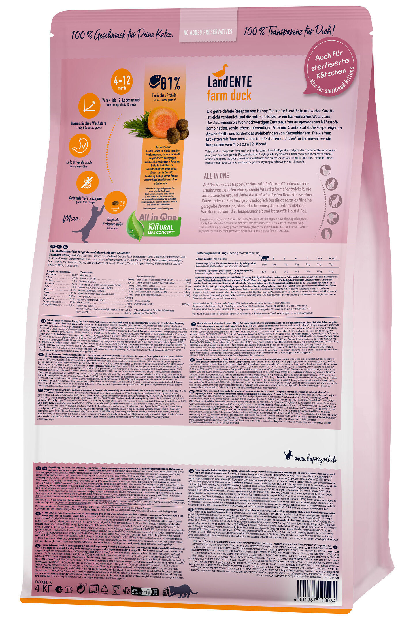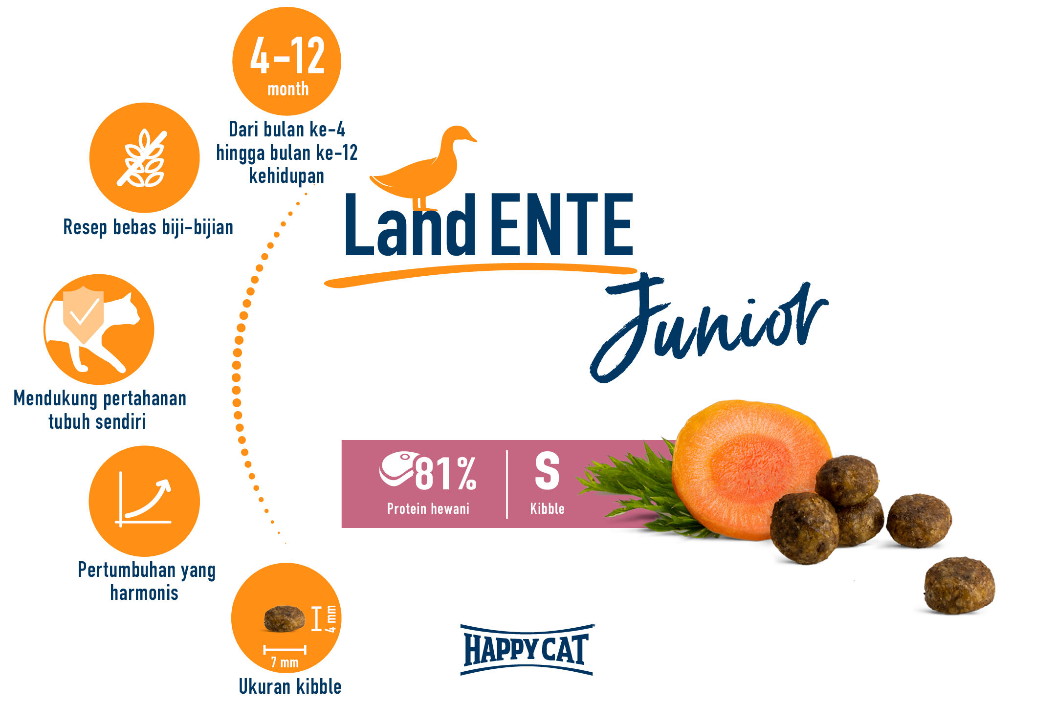 Makanan kering kami untuk anak kucing didasarkan pada Konsep All in One, sama seperti makanan kering kami untuk kucing dewasa dalam lini produk Kuliner, Sterilisasi, Indoor, Sensitif, dan Senior. Formula inovatif ini secara alami memenuhi kebutuhan terpenting kucing muda Anda. Dengan memberikan Happy Cat Junior Country Duck (atau Country Poultry), sistem kekebalan tubuh kucing Anda akan diperkuat, pencernaannya akan lancar, serta kesehatan jantung dan saluran kemihnya akan terjaga. Hal ini akan menjadi fondasi bagi kehidupan kucing yang panjang dan sehat.