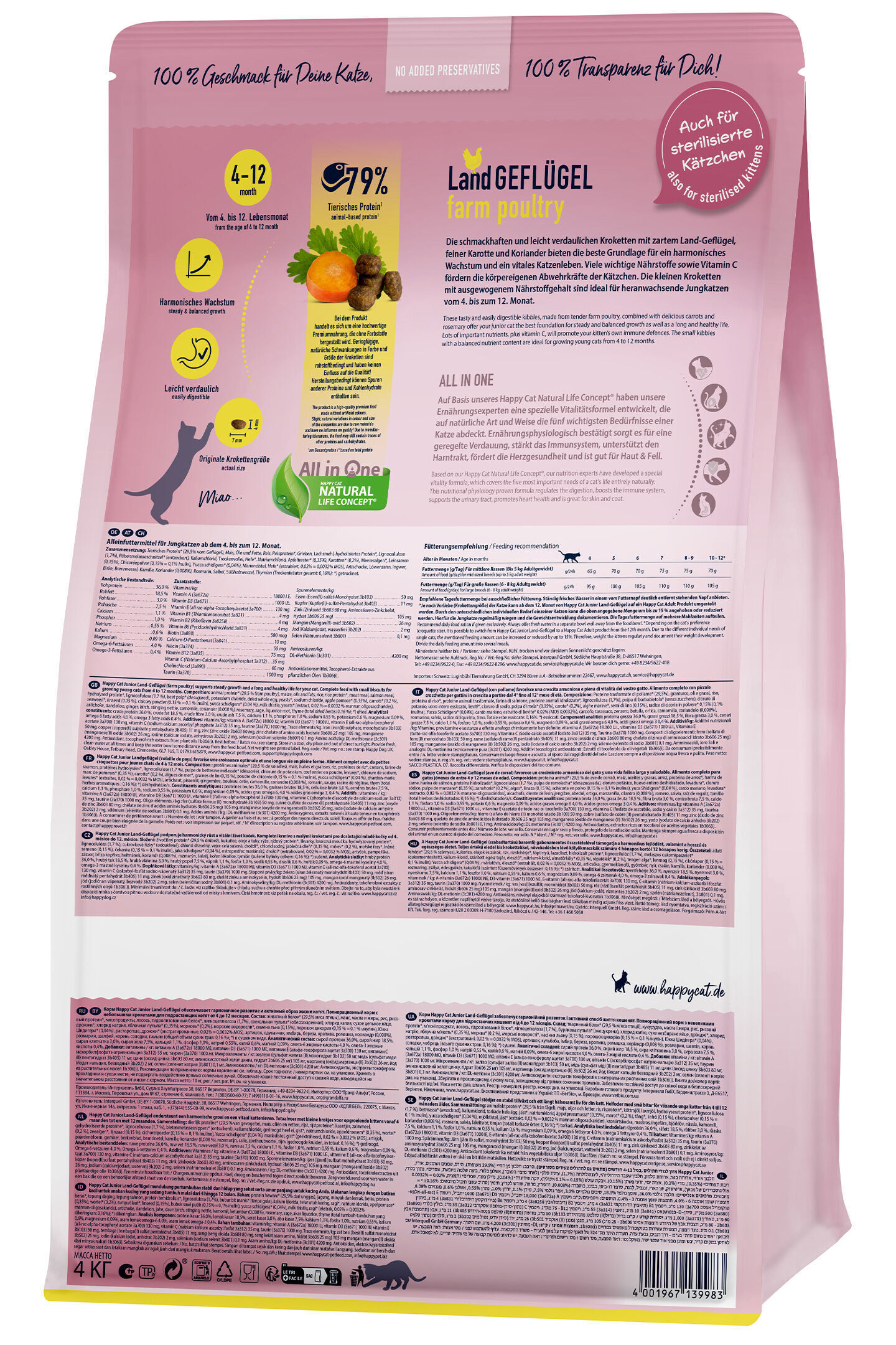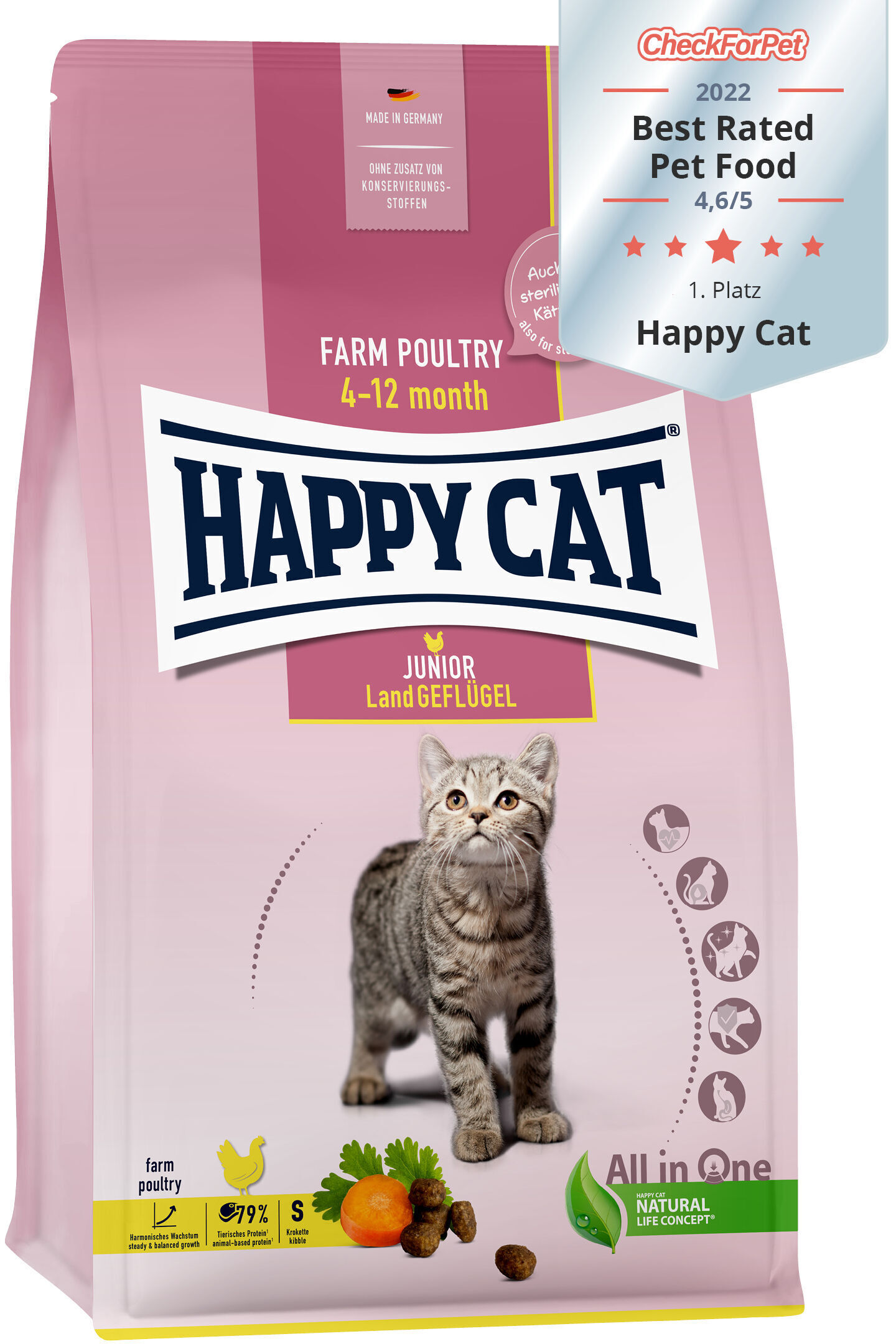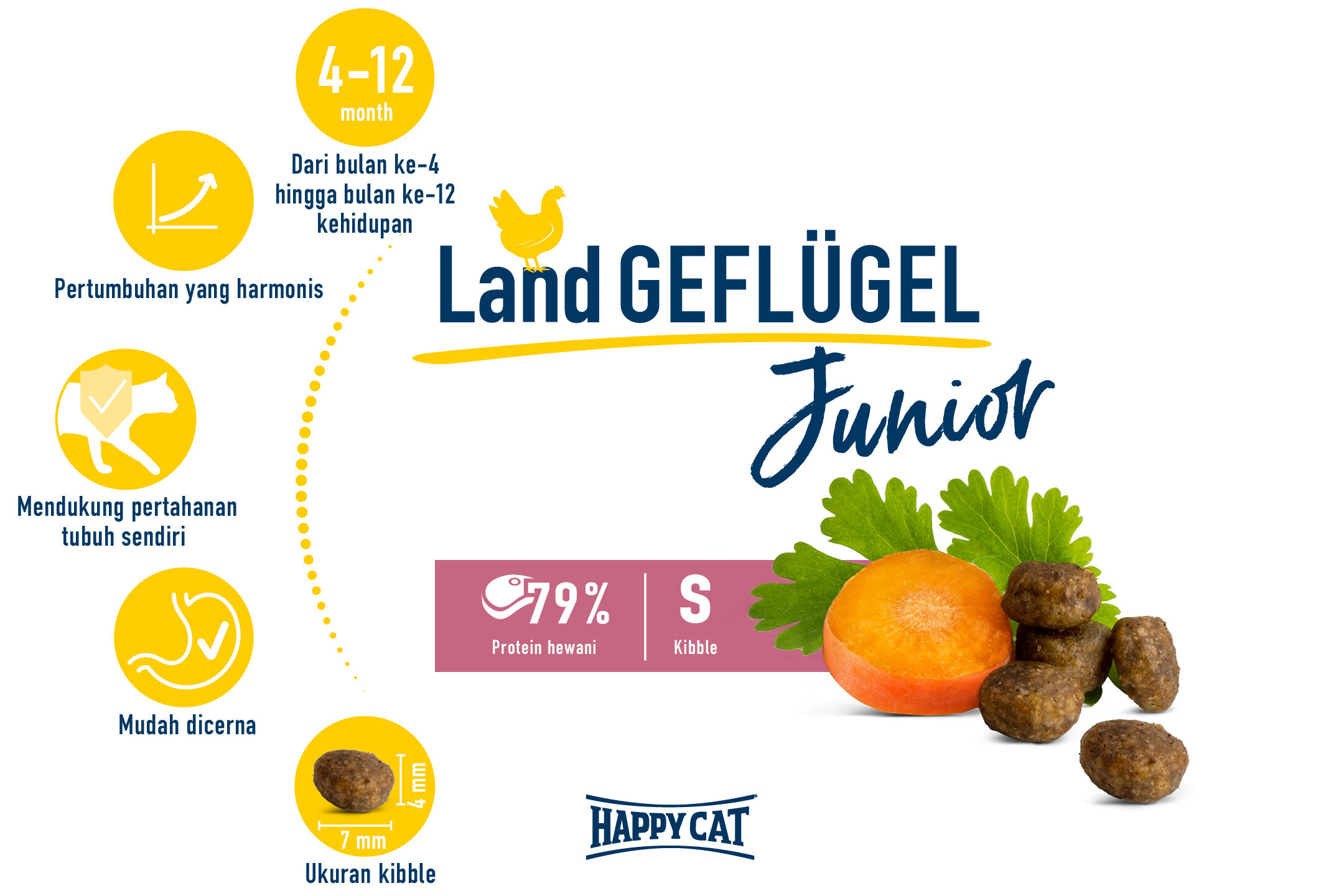 * Tergantung pada preferensi kucing (ukuran kroket), dimungkinkan untuk beralih dari produk Happy Cat Junior Land-Geflügel ke produk Happy Cat Adult mulai bulan ke-12.